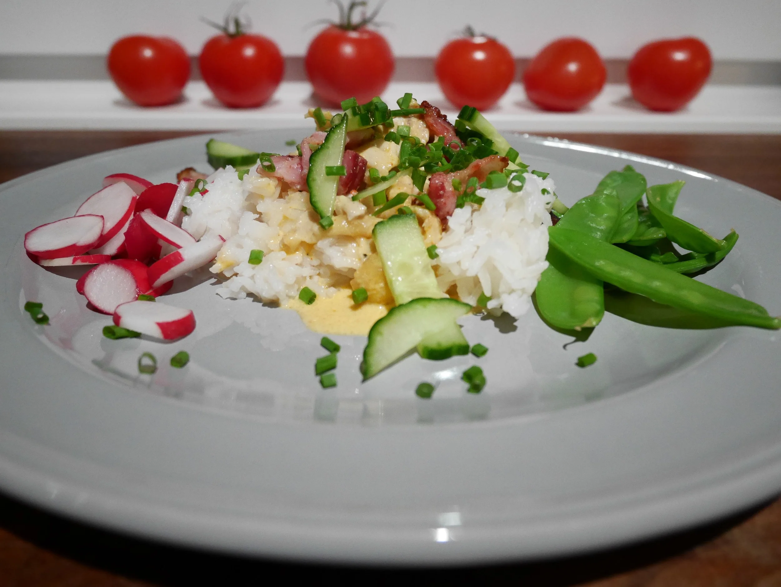 Peel and chop the garlic cloves and onion finely. Trim and cut the chicken in shreds, fry for a couple of minutes in butter in a frying pan, add garlic, onion and chopped chili. Mix cream, cube stock & mustard in a pot, add the chicken and let it simmer for 10 minutes. Season to taste. Cut the cucumber in slices, then halve them. Fry bacon in bites and let them drain on a paper towel. Add cucumber, chives and bacon to the creamy chicken and serve with rice and veggies of your choice.